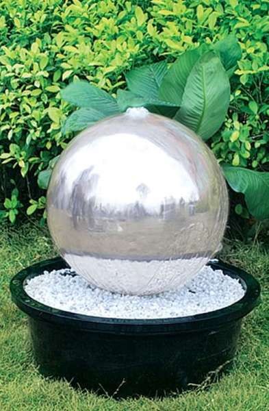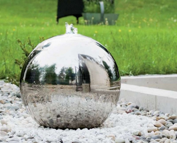 Δύο κομψά σιντριβάνια κήπου δημιουργημένα από γυαλισμένες σφαίρες ανοξείδωτου χάλυβα (διάμετρος 40cm ή 50cm).
