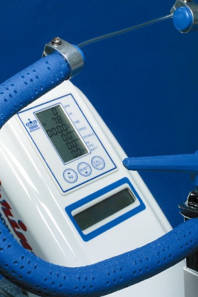Η ηλεκτρονική οθόνη δείχνει RPM, HR, TIME, SPEED και DISTANCE. Επίσης μπορεί να εισαχθεί και το φορτίο για τον υπολογισμό θερμίδων και WATT.