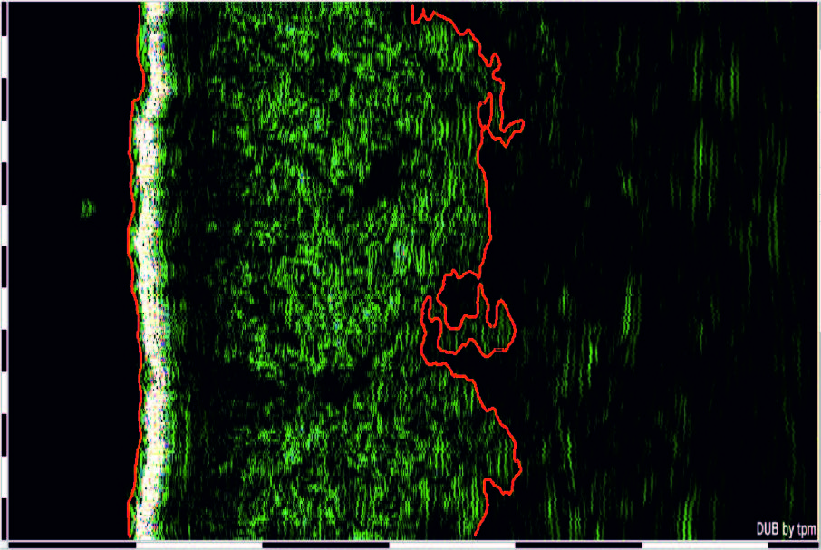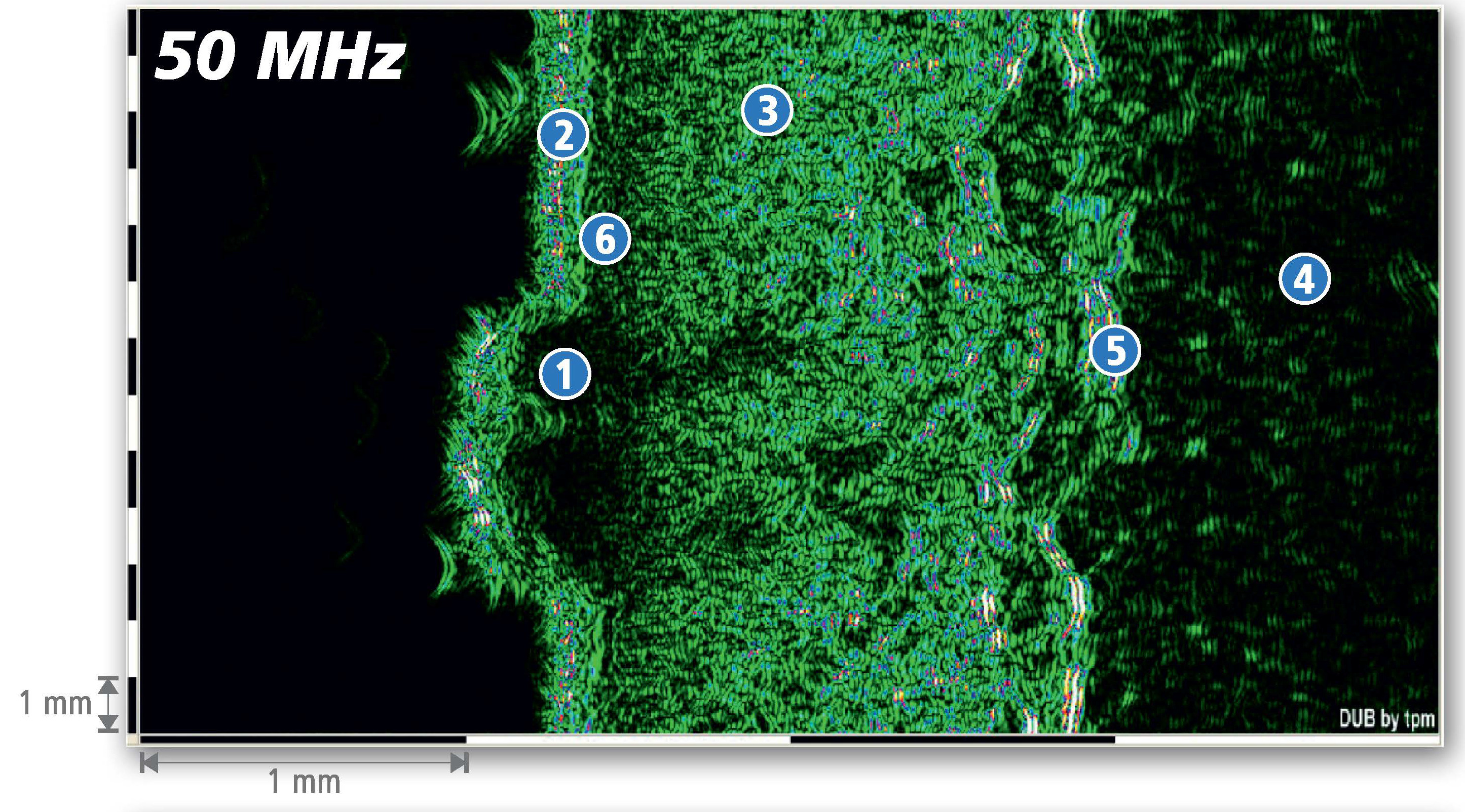 Η σάρωση RF εμφανίζει τα αρχικά ακατέργαστα δεδομένα της καταγεγραμμένης εικόνας υπερήχων. Όλοι οι υπολογισμοί και οι διαφορετικές προβολές θα υπολογίζονται πάντα από το λογισμικό DUB®SkinScanner με αυτήν τη μορφή δεδομένων για να εξασφαλίζεται η υψηλότερη ποιότητα εικόνας.