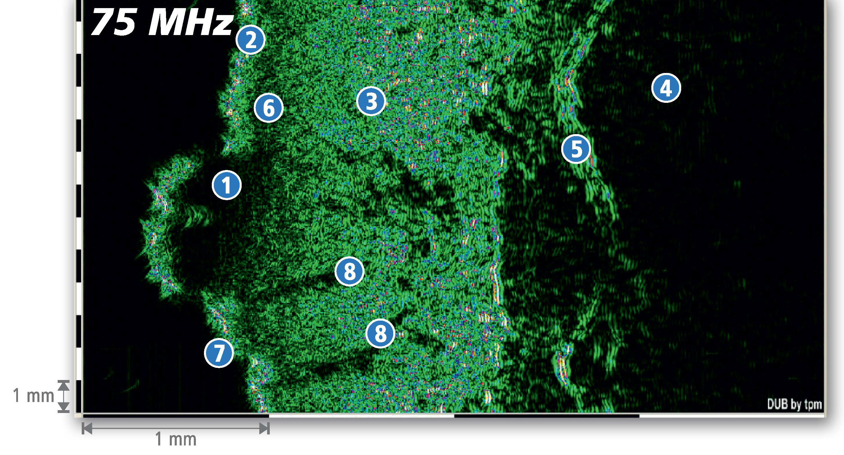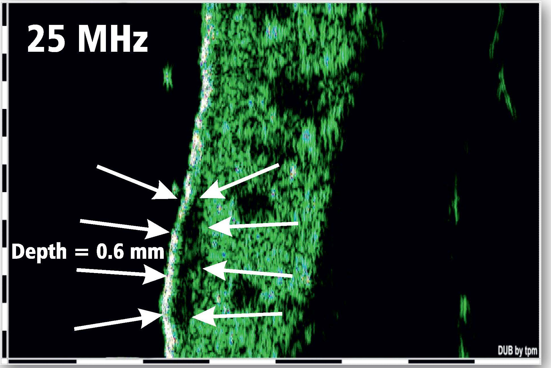 Μια πλήρης σάρωση B δημιουργείται από 384/768 γραμμές σάρωσης A. Μετατρέπεται σε μία από τις 7 διαθέσιμες κλίμακες χρώματος και 2 διαφορετικούς μετασχηματισμούς (Hilbert και Full-Wave) και δημιουργείται μια τυπική εικόνα υπερήχων υψηλής συχνότητας για κλινική αξιολόγηση.