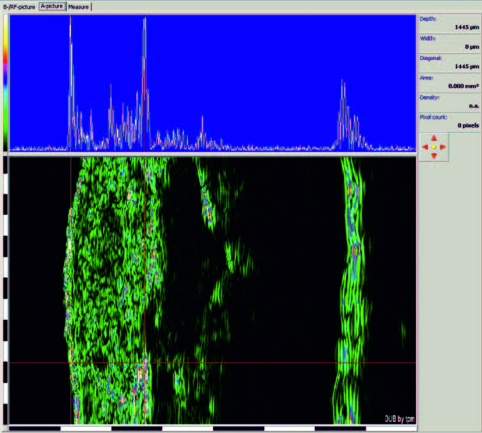 Μια πλήρης εικόνα υπερήχων αποτελείται από πολλές μεμονωμένες γραμμές σάρωσης A. Με το λογισμικό DUB®SkinScanner είναι δυνατή η προβολή όλων των μεμονωμένων γραμμών A. Μαζί με τη λειτουργία Sum-A, το πάχος του δέρματος μπορεί εύκολα να μετρηθεί.