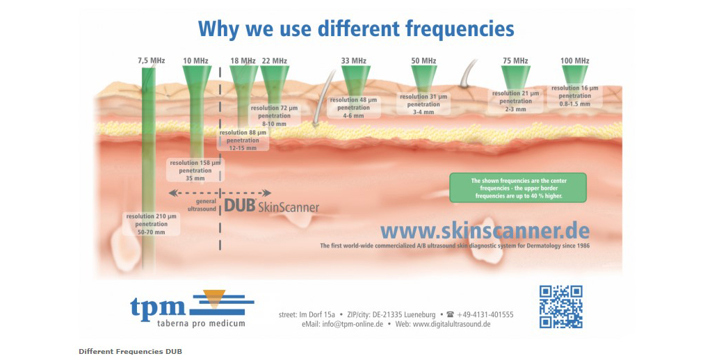 Τα συστήματα DUB®SkinScanner είναι διαγνωστικά συστήματα υπερήχων εξαιρετικά υψηλής συχνότητας και εξαιρετικά υψηλής ανάλυσης για χρήση στην κοσμητολογία, τη δερματολογία, την αισθητική και τη φαρμακευτική και κλινική έρευνα. Διατίθενται διαφορετικά μοντέλα, εκδόσεις, εύρη συχνοτήτων και επιλογές για όλες τις απαιτήσεις. Σήμερα, ο διαγνωστικός υπέρηχος 25 MHz είναι μια ευρέως διαδεδομένη μέθοδος για μη επεμβατική ανάλυση δέρματος.